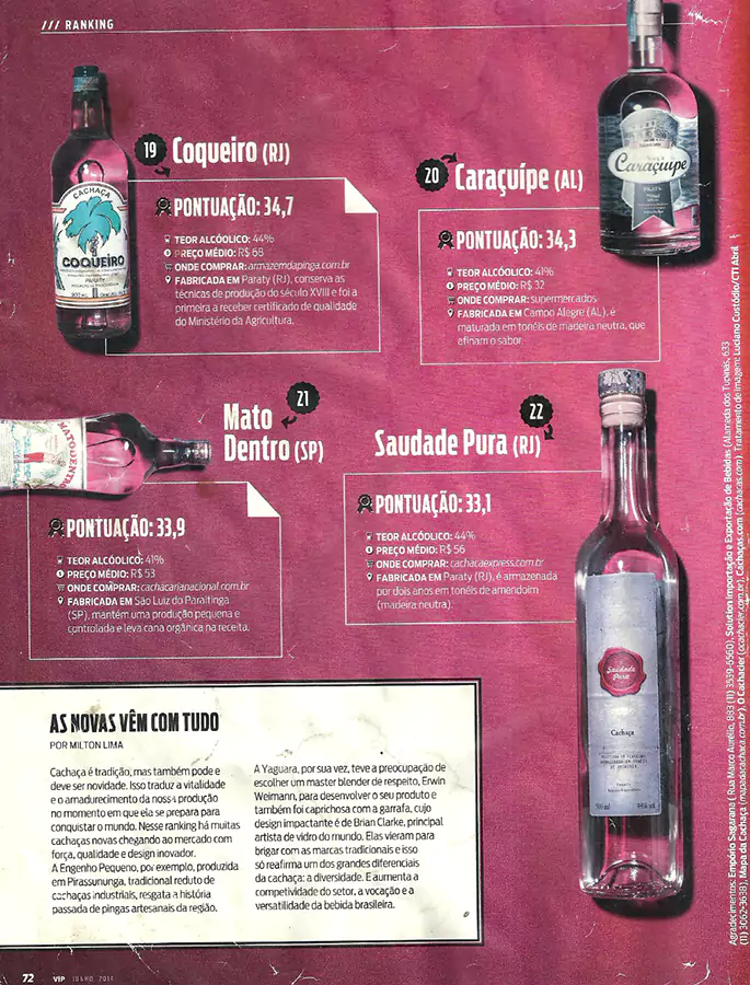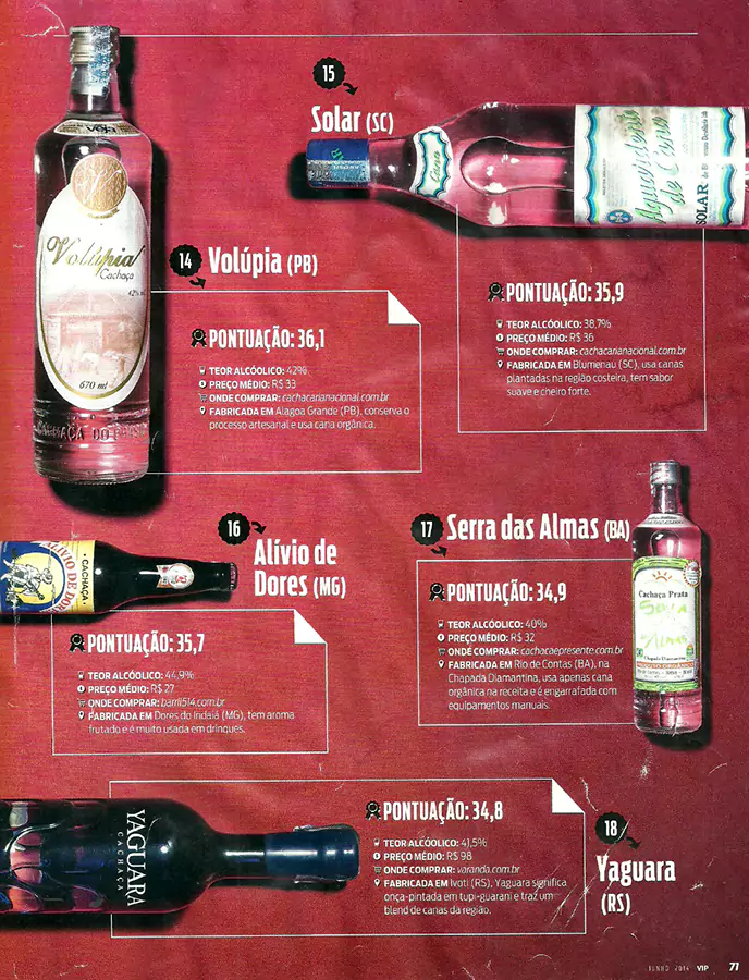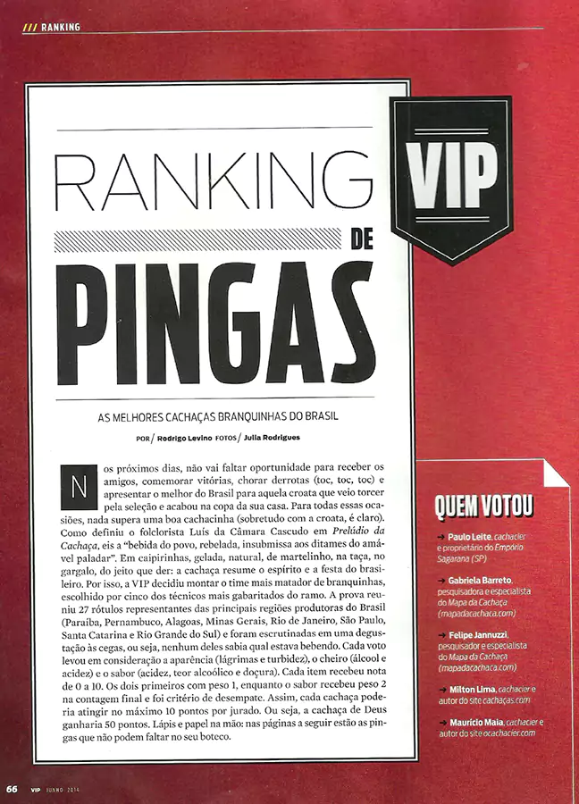 Nos próximos dias, não vai faltar oportunidade para receber os amigos, comemorar vitórias, choras derrotas (toc, toc, toc) e apresentar o melhor do Brasil para aquela croata que veio torcer pela seleção e acabou na copa d sua casa. para todas essas ocasiões, nada supera uma boa cachacinha (sobretudo com a croata, é claro). Como definiu o folclorista Luís da Câmara Cascudo em Prelúdio da Cachaça, eis a “bebida do povo, rebelada, insubmissa aos ditames do amável paladar”. Em caipirinhas, gelada, natural, de martelinho, na taça, no gargalo, do jeito que der: a cachaça resume o espírito e a festa do brasileiro. Por isso, a VIP decidiu montar o time mais matador de branquinhas, escolhido por cinco dos técnicos mais gabaritados do ramo. A prova reuniu 27 rótulos representantes das principais regiões produtoras do Brasil (Paraíba, Pernanbuco, Alagoas, Minas Gerais, Rio de Janeiro, São Paulo, Santa Catarina e Rio Grande do Sul) e foram escrutinadas em uma degustação às cegas, ou seja, nenhum deles sabia qual estava bebendo. cada voto levou em consideração a aparência (lágrimas e turbidez), o cheiro (álcool e acidez) e o sabor (acidez, teor alcoólico e doçura). Cada item recebeu peso 2 na contagem final e foi critério de desempate. Assim, cada cachaça poderia atingir no máximo 10 pontos por jurado. Ou seja, a cachaça de Deus ganharia 50 pontos. lápis e papel na mão: nas páginas a seguir estão as pingas que não podem faltar no seu boteco.